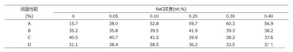 同樣根據(jù)滲透實(shí)驗(yàn)結(jié)果進(jìn)行潤(rùn)濕性能計(jì)算,具體見表3。由表3可以看到,抑塵劑A對(duì)NaCl最為敏感,隨著無(wú)機(jī)鹽含量的增加,抑塵劑在煤塵表面的潤(rùn)濕能力持續(xù)提高。當(dāng)加入0.3%NaCl時(shí),抑塵劑潤(rùn)濕相同煤塵高度所需要的時(shí)間降低至194 s,其潤(rùn)濕性能由15.7%提升至60.3%,在煤塵表面的潤(rùn)濕程度最高提升3.8倍左右;抑塵劑C對(duì)NaCl最不敏感,隨著NaCl濃度的增加,C溶液的潤(rùn)濕性能變化均比較小,潤(rùn)濕性提高程度不超過(guò)1%。對(duì)于四種抑塵劑A,B,C和D,它們對(duì)應(yīng)最佳提高潤(rùn)濕性能的NaCl濃度分別為0.3%、0.2%、0.1%和0.1%。