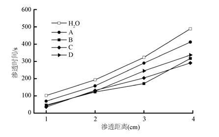 將抑塵劑A、B、C、D分別配制成0.2 wt.%的水溶液,在煤粉NR表面進(jìn)行正向滲透試驗(yàn),研究不同抑塵劑滲透煤塵距離1 cm、2 cm、3 cm、4 cm的潤(rùn)濕能力。