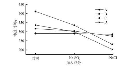 圖5.不同濃度NaCl對(duì)0.2 wt.%不同類型抑塵劑的滲透性影響