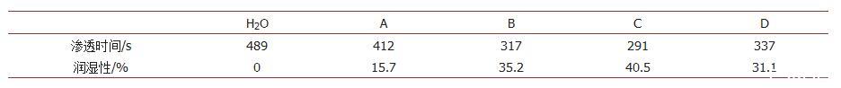分別選用了四種抑塵劑A、B、C、D,使用正向滲透法研究了抑塵劑對(duì)于煤塵NR的潤(rùn)濕能力的影響。如圖2所示,在水中加入抑塵劑可以增加在煤塵NR表面的潤(rùn)濕能力,滲透時(shí)間大幅降低。四種抑塵劑的潤(rùn)濕能力數(shù)據(jù)如表1所示,純水在煤塵表面4 cm的滲透時(shí)間為489 s。相比之下,抑塵劑C、B和D均能夠較大程度提高對(duì)煤塵的潤(rùn)濕能力,滲透時(shí)間分別降低至291 s、317 s和337 s,潤(rùn)濕能力相比純水分別提高了40.5%、35.2%和31.1%。抑塵劑A的潤(rùn)濕能力相對(duì)較差,滲透相同煤塵距離所需要的時(shí)間為412 s,潤(rùn)濕能力比純水僅提高了15.7%。