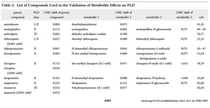 已經(jīng)有許多出版物描述了PLD藥物代謝產(chǎn)物所致。其中,初級代謝輕的胺碘酮,去乙基胺碘酮,已經(jīng)討論過14,38-40優(yōu)先積累代謝物已觀察到胺碘酮過量,尤其是短期39這為我們的檢測數(shù)據(jù)提供了可能的解釋其中去乙基胺碘酮是胺碘酮的主要代謝物,41,42表現(xiàn)出更高的PLD誘導潛力。相似地,8-羥基米安色林之間的CMC位移差異,米安色林、43,44和米安色林的主要氧化代謝物比其他兩個之間的差異更顯著成對的親本和代謝物。由于溶解度的限制,父母和代謝組的劑量濃度不同氯氮平和米安色林。這可能是導致觀察到的CMC偏移的顯著差異母體和代謝物之間。在較低濃度下測試時相比之下,氯氮平從低電位誘導劑轉變?yōu)榉钦T導劑,而米安色林仍然作為誘導劑但具有更高的CMCDL/CMCL值。值得注意的是,目前測試集中的大多數(shù)CAD被報告為氧化代謝其相應的脫烷基初級代謝物。為了了解相應初級的PLD電位代謝物,我們測試了額外的代謝物。之間測試的代謝物是初級去甲基代謝物氯丙嗪、45?47阿米替林、48?50丙咪嗪、43,50和pri-氯喹的瑪麗和次級脫乙基代謝物。51,52此外,由雜原子氧化形成的氧化代謝物地昔帕明43,50和氯胺酮的重釋和脫烷基代謝物pramine53,54進行了評估。與其他CAD一樣,代謝物可以如果它們具有合適的理化性質(zhì),則誘導PLD。32相反,代謝物將失去結合能力如果CAD特征丟失,則使用脂質(zhì),例如用脂質(zhì)觀察氯米帕明N-氧化物和地昔帕明N-羥基(圖4和表2)。