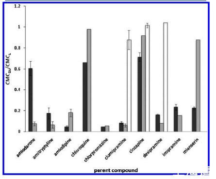 圖5.CMC偏移(由CMC之間的比率表示)藥物-脂質(zhì)復合物(DL)和單獨脂質(zhì)的CMC(L):CMCDL/CMCL)的測試化合物(黑色)及其主要代謝物(灰色、初級代謝物;白色,次生代謝物)在pH 7.2中分析HEPES緩沖液。使用的藥物濃度為1 mM,除非另有說明見表2。誤差線被分配給那些n g3測試的化合物。對于氯氮平和米安色林,均為0.91和0.091 mM用于測試,但僅來自1 mM測試的數(shù)據(jù)被策劃。