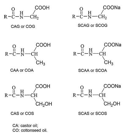 ?;被岜砻婊钚詣聪鄳?yīng)的CAG、COG、CAA、COA、CAS和COS的鈉鹽,通過(guò)用NaOH水溶液中和?;被嶂羛H 8-9直至獲得完全澄清的溶液來(lái)制備。這些鈉鹽分別命名為SCAG、SCOG、SCAA、SCOA、SCAS和SCOS。
