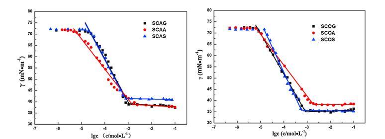 圖1 6種來(lái)自蓖麻油(左)和棉籽油(右)的?;被岜砻婊钚詣┰?5°C下的表面張力曲線。畫(huà)線以顯示斷點(diǎn)。