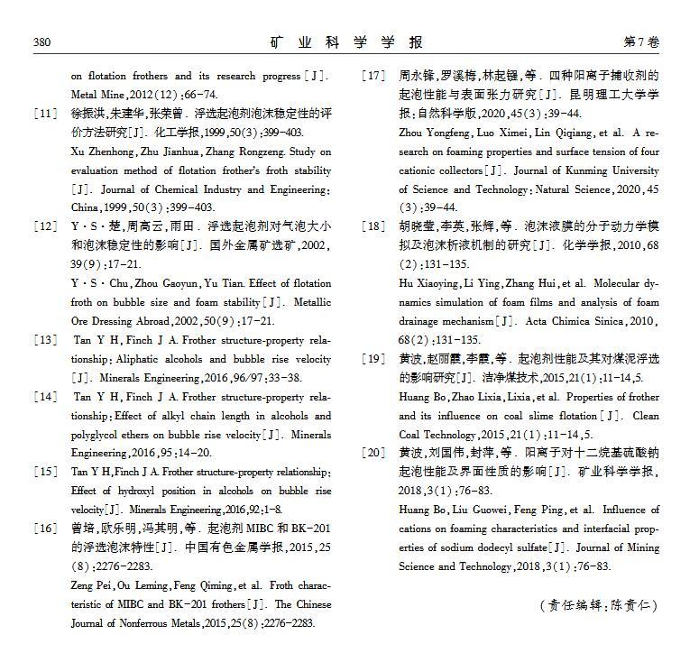 【摘要】:浮選是分離微細(xì)物料的重要方法,起泡劑類型和泡沫穩(wěn)定性顯著影響浮選效果。本文選取醇類(MIBC)、酯類(DEP)和醚醇類(DGBE)三種起泡劑,通過實(shí)驗(yàn)研究官能團(tuán)對(duì)起泡性能和泡沫穩(wěn)定性的影響。實(shí)驗(yàn)用Foamscan測(cè)定起泡劑溶液的起泡性能和泡沫穩(wěn)定性,用Tracker流變儀測(cè)定表面張力和氣液界面黏彈模量。研究結(jié)果表明:起泡速率隨表面張力的減小呈線性增大,當(dāng)氣液界面吸附起泡劑達(dá)到飽和時(shí)起泡速率最大,其中MIBC的起泡速率最高,DGBE最??;起泡劑濃度為臨界質(zhì)量分?jǐn)?shù)時(shí),起泡能力最大,MIBC、DEP和DGBE的臨界質(zhì)量分?jǐn)?shù)分別為1.1%、0.4%和0.8%;氣泡的大小隨溶液表面張力減小而減小,氣泡平均尺寸由大至小順序?yàn)椋篋GBEDEPMIBC;在泡沫穩(wěn)定性方面,醚醇類起泡劑最強(qiáng),醇類起泡劑最差,同時(shí)MIBC、DEP和DGBE質(zhì)量分?jǐn)?shù)分別為0.4%、0.5%和0.8%時(shí),起泡劑生成的泡沫最穩(wěn)定。