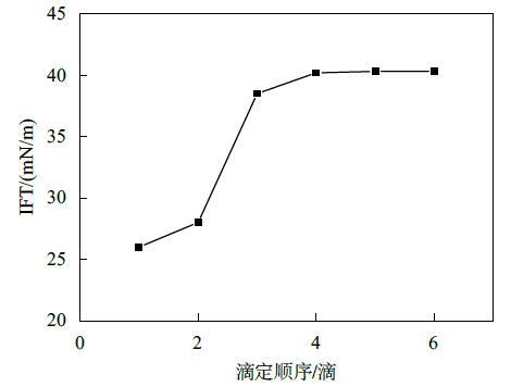 結果表明,液滴懸置5 min后,第一滴液滴表面張力值最小,隨著連續(xù)滴定的進行,液滴表面張力值逐漸增大,最終趨于平衡。究其原因,可能是由于懸置一段時間后,表面活性劑分子在表面充分吸附,所以第一滴液滴表面張力最小,而隨著連續(xù)滴定進行,由于平衡時間較短,表面活性劑分子在液滴的表面吸附未達平衡,所以數值逐漸增大,然而滴加液滴的速度一定,表面活性劑分子在表面的遷移速率一定,降低表面的能力與效率一定,最終會達到一個穩(wěn)定值。而平衡時間的長短,與表面活性劑分子的性質有關,遷移吸附速率快的表面活性劑分子所需時間較短。由此可見,使用懸滴法測定表面張力時,時間效應的影響不可忽略。