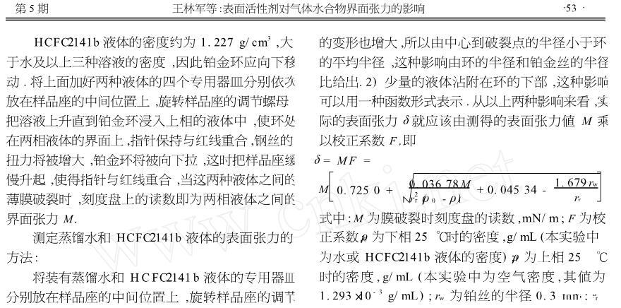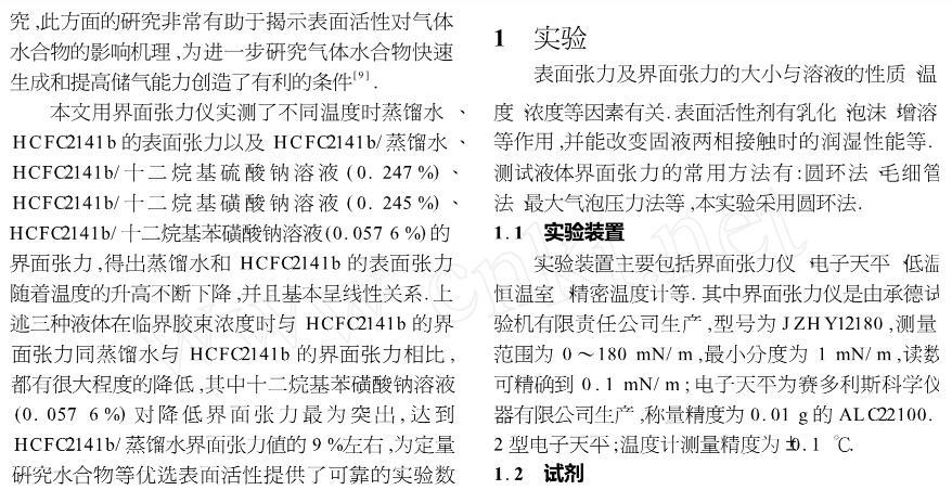 【摘要】:表面活性劑能夠減小液體的表面張力以及兩相液體間的界面張力,界面張力的減小有利于促進(jìn)氣體水合物快速形成和提高水合物儲氣能力.為定量研究兩相液體間界面張力對氣體水合物形成的影響,用界面張力儀實(shí)測不同溫度時(shí)蒸餾水、HCFC-141b的表面張力以及HCFC-141b/蒸餾水、HCFC-141b/十二烷基硫酸鈉溶液(0.247%)、HCFC-141b/十二烷基磺酸鈉溶液(0.245%)、HCFC-141b/十二烷基苯磺酸鈉溶液(0.057 6%)的界面張力,測試結(jié)果表明,表面活性劑對降低兩相液體間界面張力的作用十分明顯,其中十二烷基苯磺酸鈉溶液對降低界面張力最為突出,降到HCFC-141b/蒸餾水界面張力值的9%左右,為定量研究氣體水合物等優(yōu)選表面活性劑提供了科學(xué)的依據(jù)。