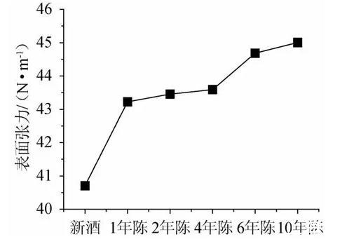 表面張力為衡量液體體系的一個熱力學(xué)穩(wěn)定性參數(shù),黃酒從本質(zhì)來講就是乙醇-水分子的締合體系與其他氨基酸、微量風(fēng)味物質(zhì)等構(gòu)成的液體體系,所以黃酒具有一般液體所具有的本質(zhì)屬性。實驗所用黃酒為不同年份相同工藝釀造的黃酒原酒,可以認為這些酒樣具有一定的穩(wěn)定性,可以用來研究黃酒在陳釀過程中的陳化特征規(guī)律。按照表面張力分析方法檢測6個年份黃酒的表面張力,結(jié)果如下圖,可以看出,黃酒的表面張力隨著陳釀時間延長整體呈上升趨勢。