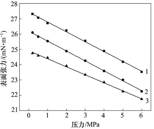 為了研究溫度和壓力對煙道氣?稠油平衡表面張力的影響,分別在80,100和120℃下進(jìn)行實(shí)驗(yàn),圖2所示為不同溫度下煙道氣?稠油平衡表面張力隨壓力變化曲線。由圖2可見:當(dāng)氣體壓力從0.2 MPa升高到6 MPa,在80℃時(shí),煙道氣?稠油表面張力由27.31 mN/m減小到23.53 mN/m,降低了13.84%;在100℃時(shí),煙道氣?稠油表面張力由26.10 mN/m減小到22.26 mN/m,降低了14.71%;在120℃時(shí),煙道氣?稠油表面張力由24.75 mN/m減小到21.75 mN/m,降低了12.12%。當(dāng)溫度一定時(shí),煙道氣?稠油系統(tǒng)的平衡表面張力隨著壓力的增大而減小,并呈較好的線性關(guān)系。這是因?yàn)闇囟纫欢〞r(shí),壓力增大,煙道氣在稠油中的溶解度增大,使得平衡表面張力減小。當(dāng)壓力一定時(shí),煙道氣?稠油系統(tǒng)的平衡表面張力隨溫度的升高而減小。這是因?yàn)闊煹罋獾闹饕煞质荖2,N2在稠油中的溶解度隨著溫度升高而增大。