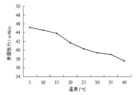 由圖1可以看出合成血液表面張力隨著溫度的升高而減少,從原來的45.149mN/m降至37.540mN/m。因?yàn)殡S著溫度升高,分子鍵引力減弱,表面張力隨溫度升高而減少。同時,溫度升高,液體的飽和蒸氣壓增大,氣相中的分子密度增加,氣相分子對液體表面分子的引力增大,導(dǎo)致液體表面張力減少。