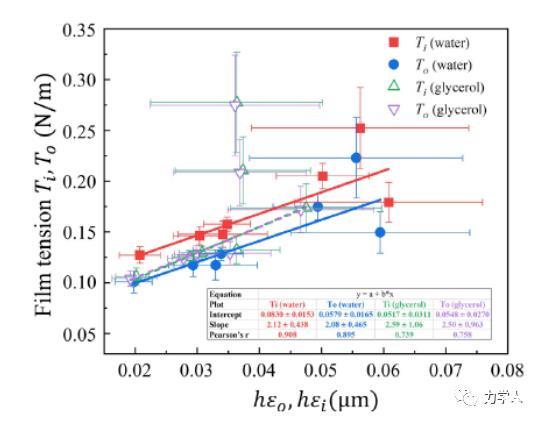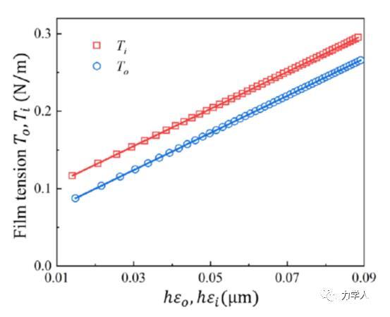 基于該平衡構型的解析解,本研究發(fā)現(xiàn)薄膜在接觸線附近的彈性應變可以由薄膜的鼓包角解析給出。由此,本文給出了在一般條件下,薄膜在接觸線附近的彈性應變隨鼓包角的解析關系。圖3表明,基于該解析關系給出的薄膜彈性應變可以很好的描述薄膜總張力隨薄膜厚度及接觸線附近應變的演化規(guī)律。基于此,本文提出了采用線性外推薄膜總張力隨薄膜厚度和接觸線附近薄膜應變乘積的方法來確定固體表面張力的方案。